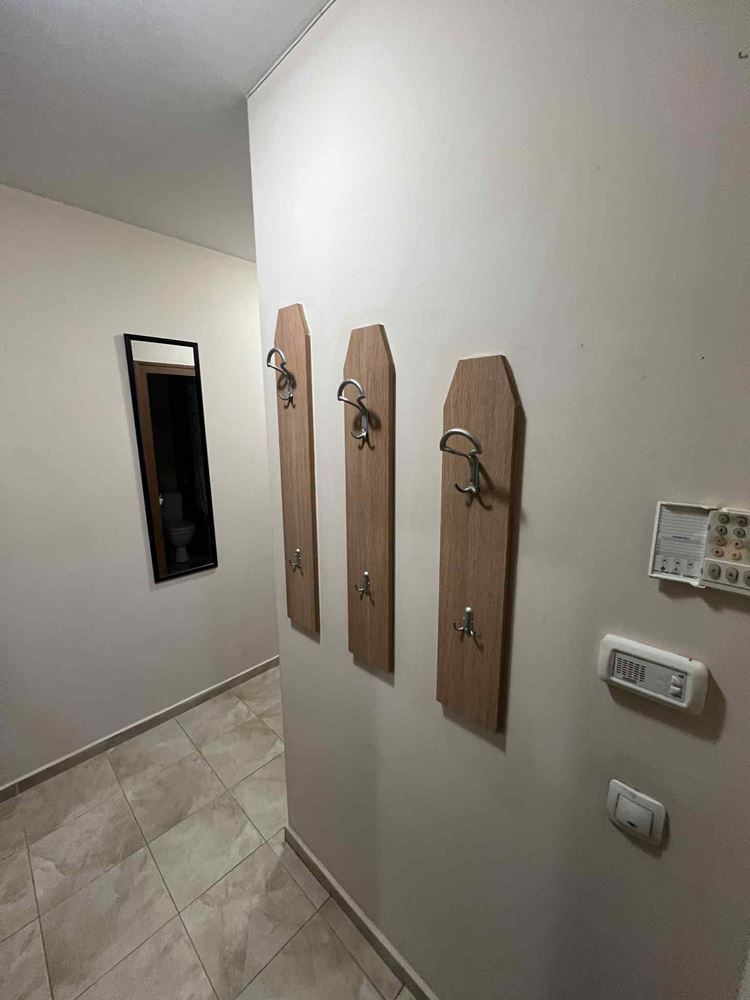 Апартаментът има следното разпределение – широк и удобен Г-образен коридор, кухня с хол от 25 кв.м, с всички необходими електроуреди за едно домакинство,
