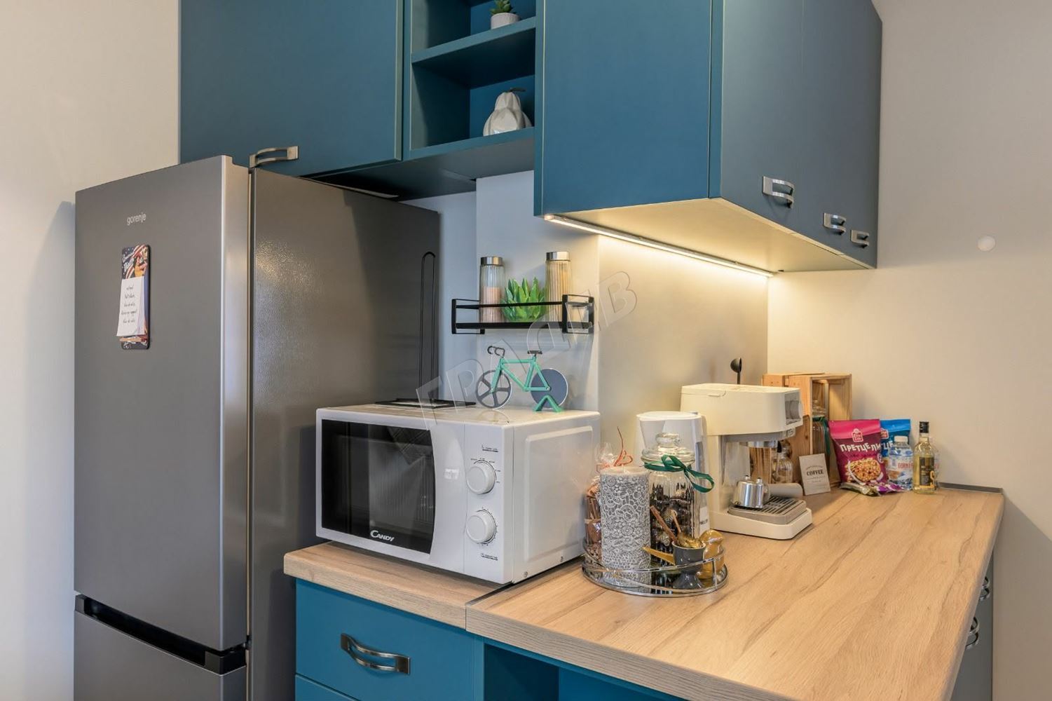 Апартаментът е напълно обзаведен и оборудван с всок клас електроуреди – готварска печка с керамичен плот, аспиратор, телевизор, хладилник, съдомиялна, пералня със сушилня, климатик Дайкин.