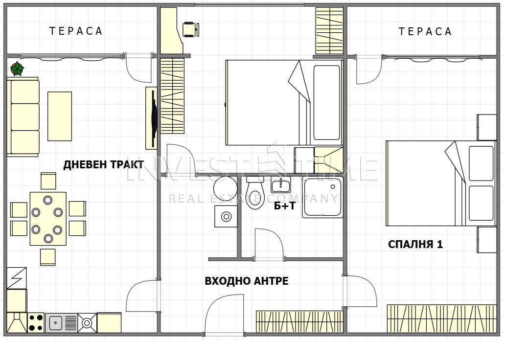 На чистата площ от 61 кв.м се разпределени: Дневен тракт – 18 кв.м с излаз на тераса, спалня – 12 кв.м, втора спалня – 18 кв.м с излаз на втора тераса, входно антре с обособена ниша за бойлер и пералня и общ санитарен възел. Към жилището има прилежащо избено помещение с площ 3,46 кв.м.